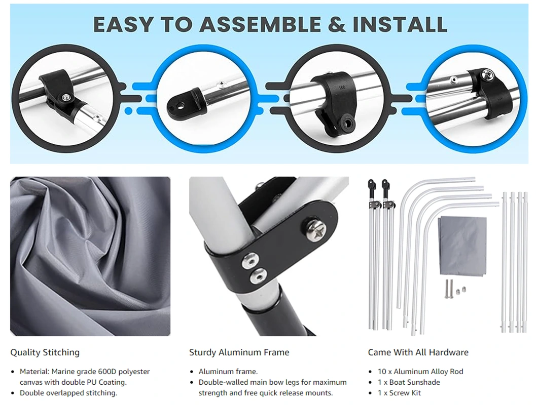 Aluminium Extensible Boat Canopy.Suitable pikeun dinghy inflatable, kanu, kayak, parahu fishing. Parahu kami ngiuhan ngajaga anjeun tina panonpoé sareng hujan, idéal pikeun parahu Runabout, V-Hull Boats, Jon Boat, Bass Boats, Inflatable Boats, Fiberglass BoatsZhejiang Jiayu Outdoor Products Co., Ltd bisa réngsé dina ngan sababaraha menit tanpa husus. alat supados anjeun tiasa gampang sareng gancang masangna.