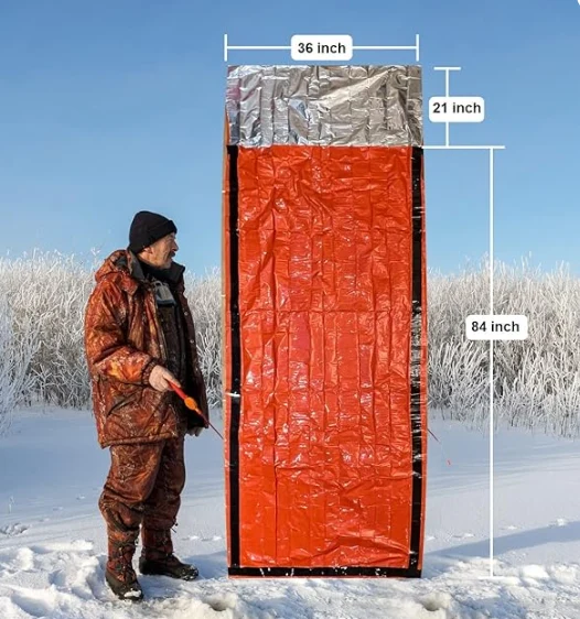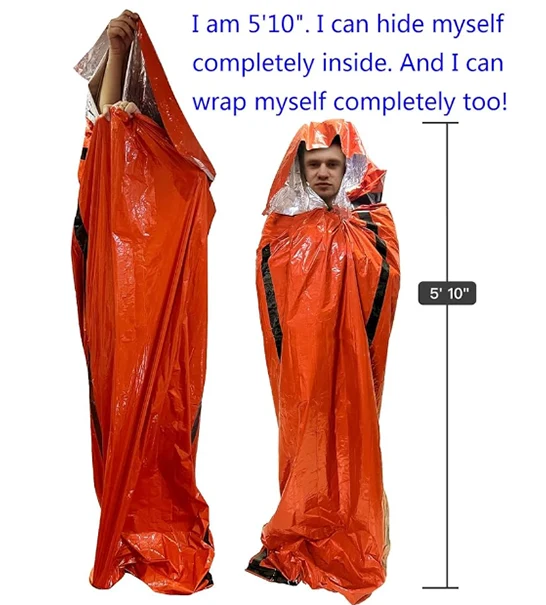 Konvesnis darurat bobo tamat tiasa ningkatkeun kasempetan anjeun dina sadaya cuaca, sadaya musim sareng sagala kaayaan. Éta didamel tina bahan mylar mylar dirancang ku NASA kanggo éksplorasi rohangan. Éta nahan / ngagambarkeun deui 90% tina panas awak. Éta tiasa dianggo, waterproof sareng angin.