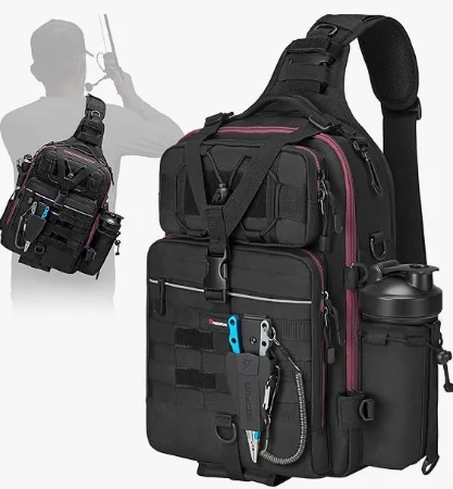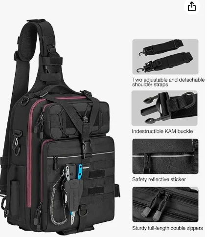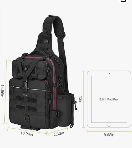 Tempat taktak anu tiasa dileungitkeun supados gampang nganggo kantong ieu salaku kantong taktak condong, kantong, kantong dada, kantong tackle perunggu, atanapi kantong perjalanan. Kalayan dua sabuk rod pikeun nahan rod anjeun, panjang tali utama tiasa diperpanjangkeun 51.2 '' ', bari tali asuhan tiasa diperpanjang ka 36,2' ''