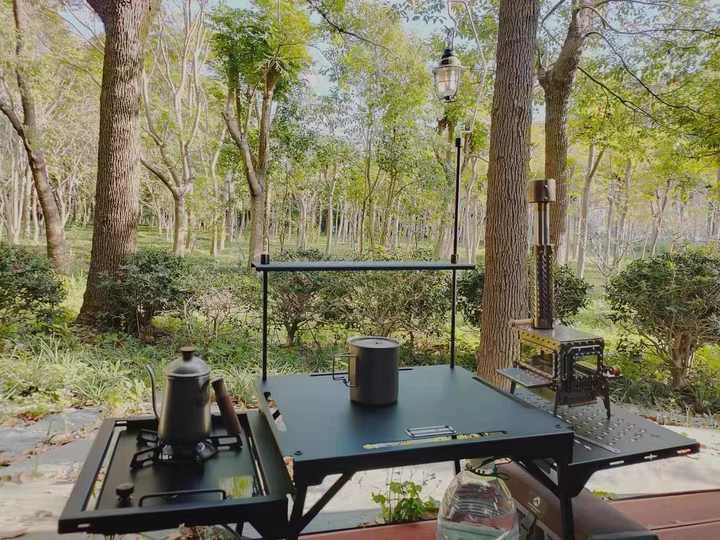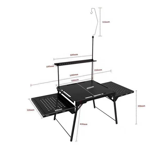 Méja kipas portinum-beusi-beusi-beusi, plat platform nganggo platform nganggo anu diwangun ku luhur, tengah, sareng handap bagian, sareng kamar anu cekap pikeun nyimpen sagala jinis poloundware, kadaharan, sareng condiménsi.