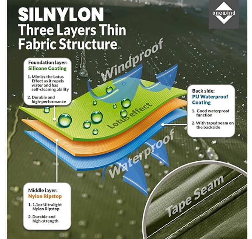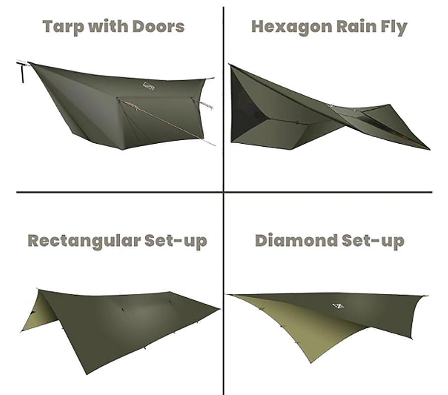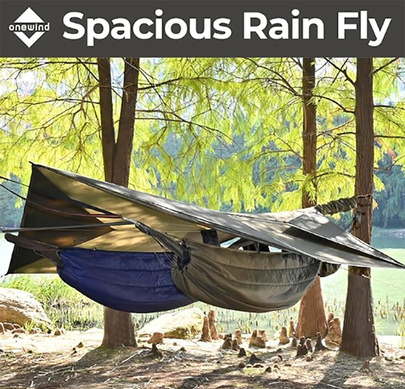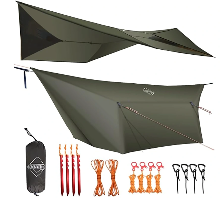 Portabel Waterproof Camping Hammock delivers shielding alus teuing tina elemen - hujan, panonpoé, sinar UV jeung angin. Éta dijieun tina 1.1oz 20D ripstop silnylon anu diolah ku silikon / PU 4000mm sahingga bahanna tahan cai.